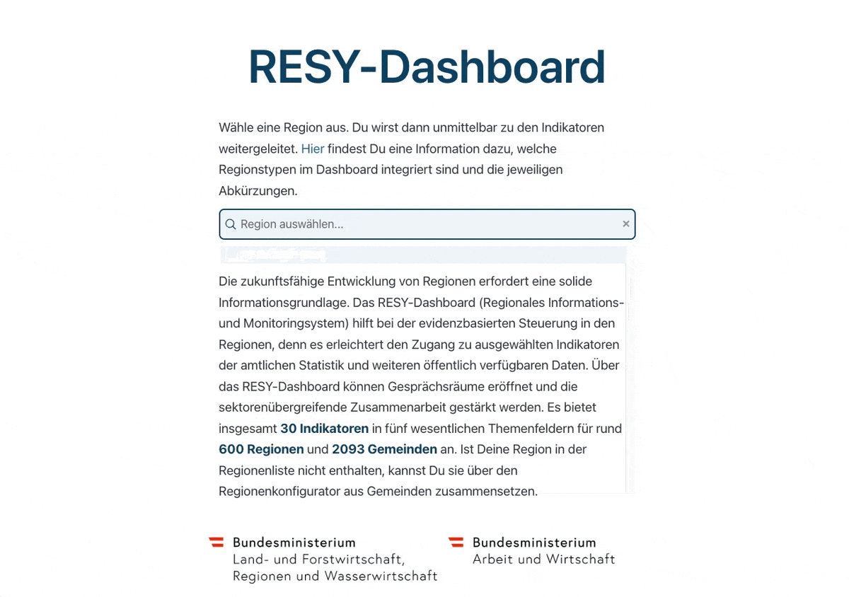 View projectThe sustainable development of regions requires a solid information base. The RESY Dashboard (Regional Information and Monitoring System) supports evidence-based regional management by providing easy access to selected official statistics and other publicly available data. It offers a total of 30 indicators across five key topic areas for around 600 regions and 2,093 municipalities.